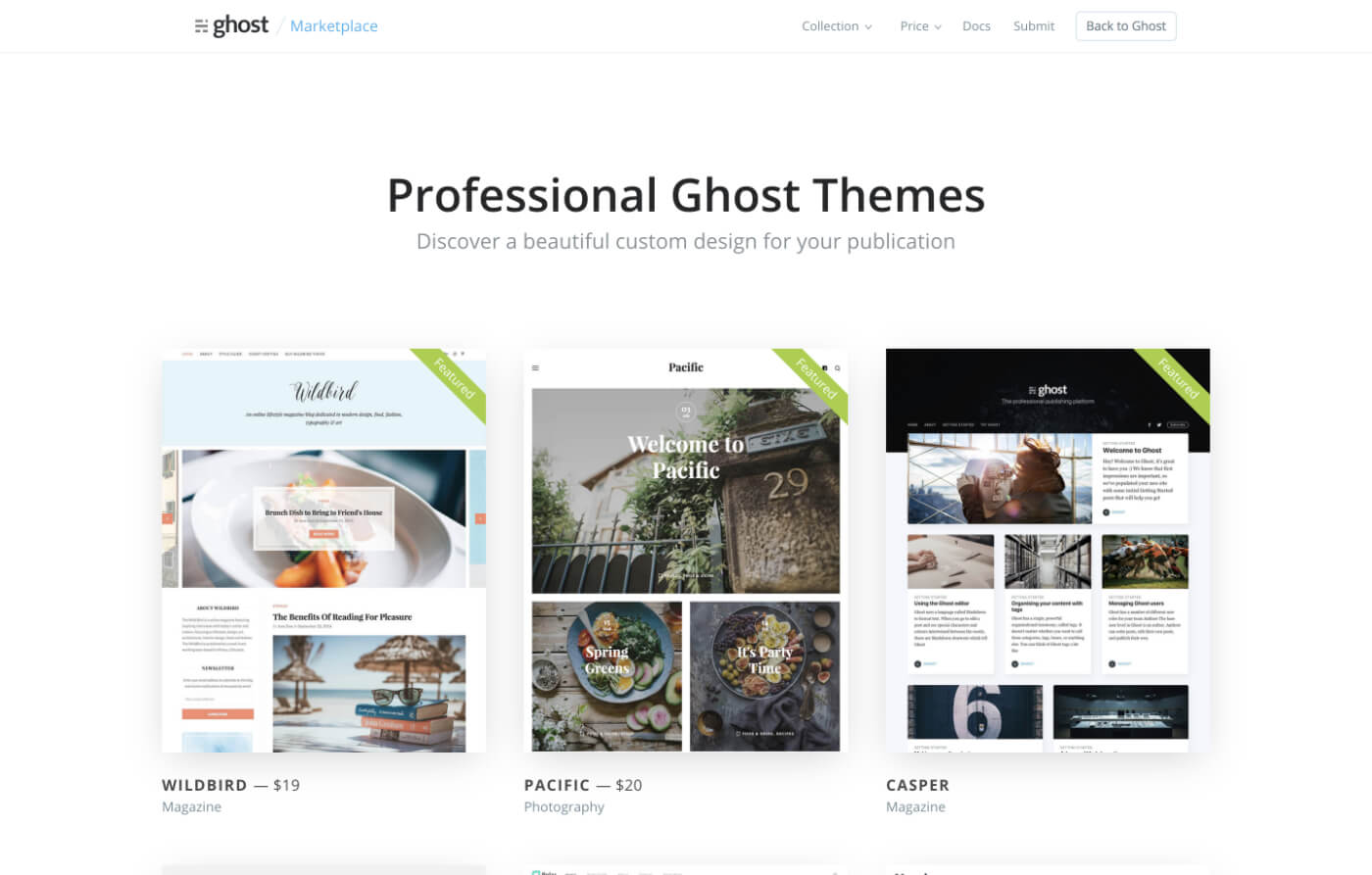 There are a huge range of both free and premium pre-built themes which you can get from the Ghost Theme Marketplace, or you can create your own from scratch.